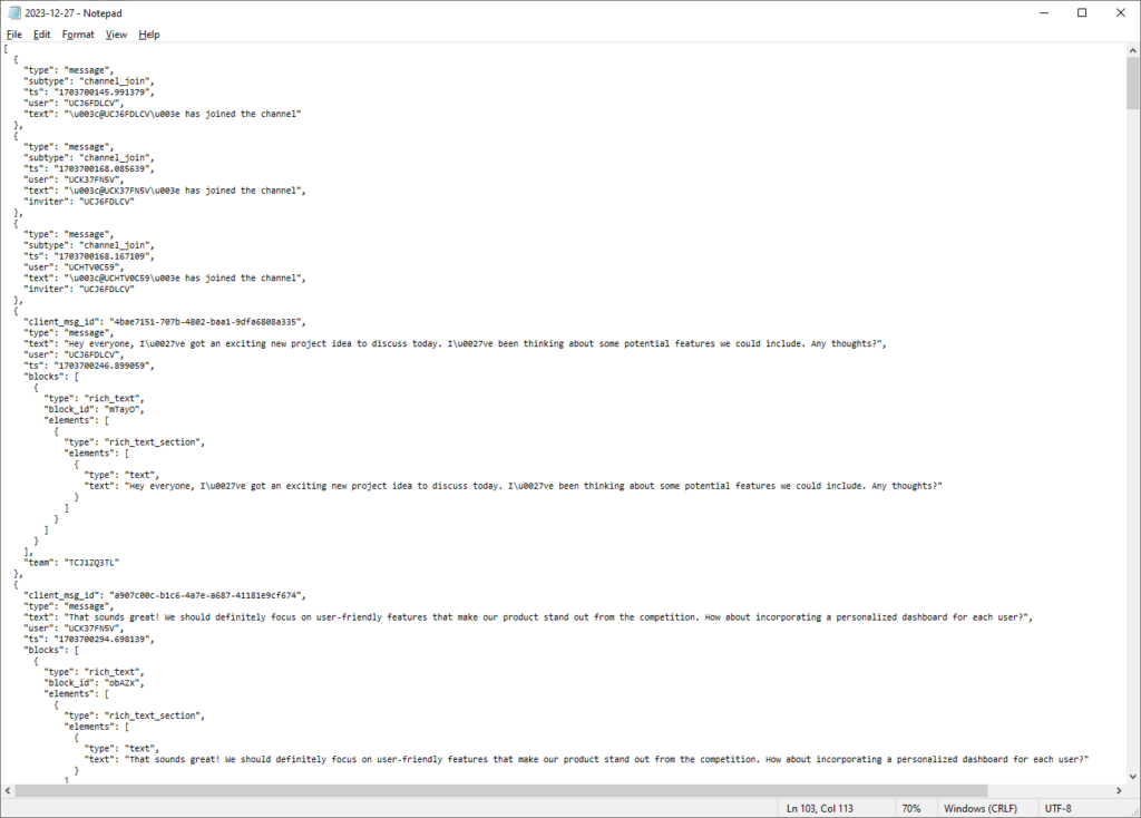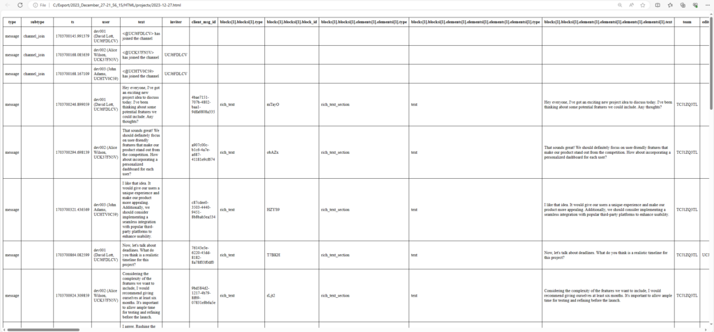 - The exported data in the JSON format is compatible with the Slack import tools so the data may be imported back to Slack